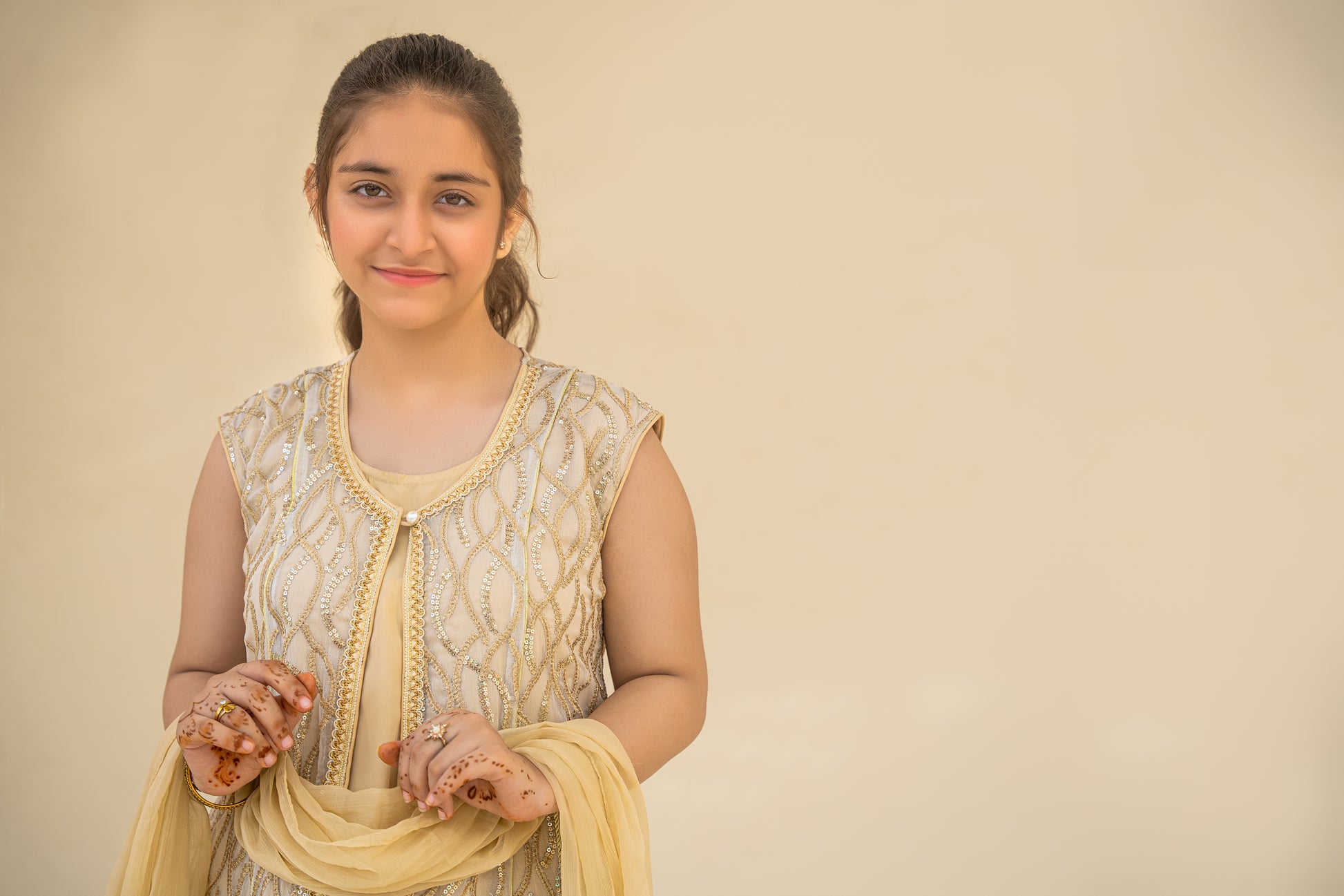DescriptionSHIRT: Front open 4-Kali with all over Sitara/zari Embroideryand lace on hem. |